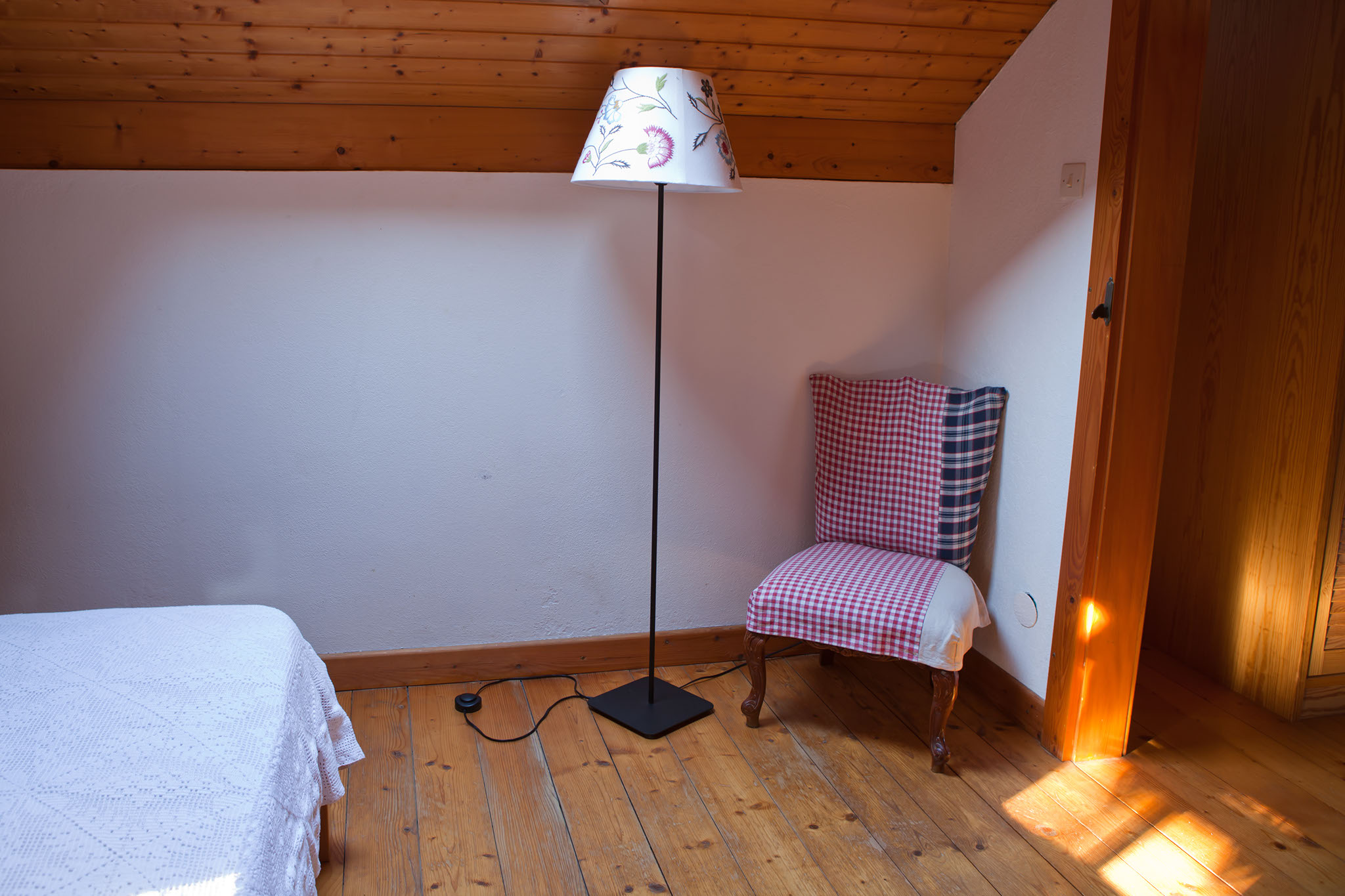 Avec son velux et sa petite fenêtre ouvrant dans le rosier grimpant sur la façade, la chambre châtaigne se pare de lumière.